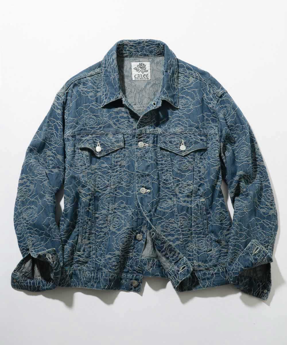 デニム上下で華のある装いを楽しみたい!? それなら、ローズ柄が浮かぶこのセットアップを。デニムの産地・岡山県伊原市で仕立てたオリジナル生地は、緯糸で表現したローズ柄が特徴的。ブリーチ加工を施した淡いインディゴとのコントラストで、この柄をさりげなく印象づけられる。パンツは流行に左右されない、大人のレギュラーストレートシルエット。