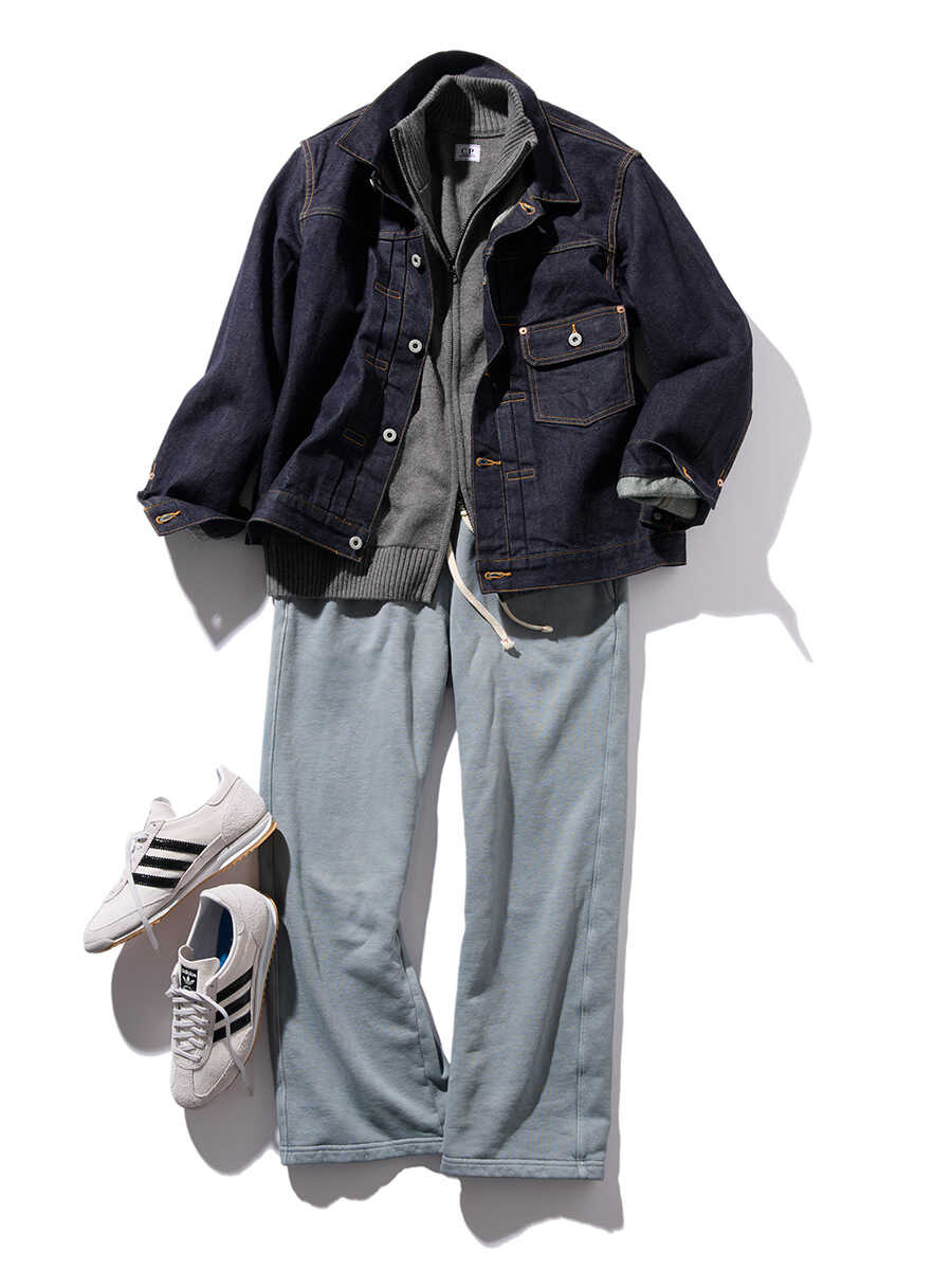 淡いデニムのようなブルーが新鮮な〈レス ティエン〉のスウェットパンツ。シンプルで汎用性が高く、ジャスト丈で仕立てているから部屋着感が出すぎず幅広いシーンに活躍。ドローコードはホワイトを採用し、ウエストまわりのさりげないアクセントに。