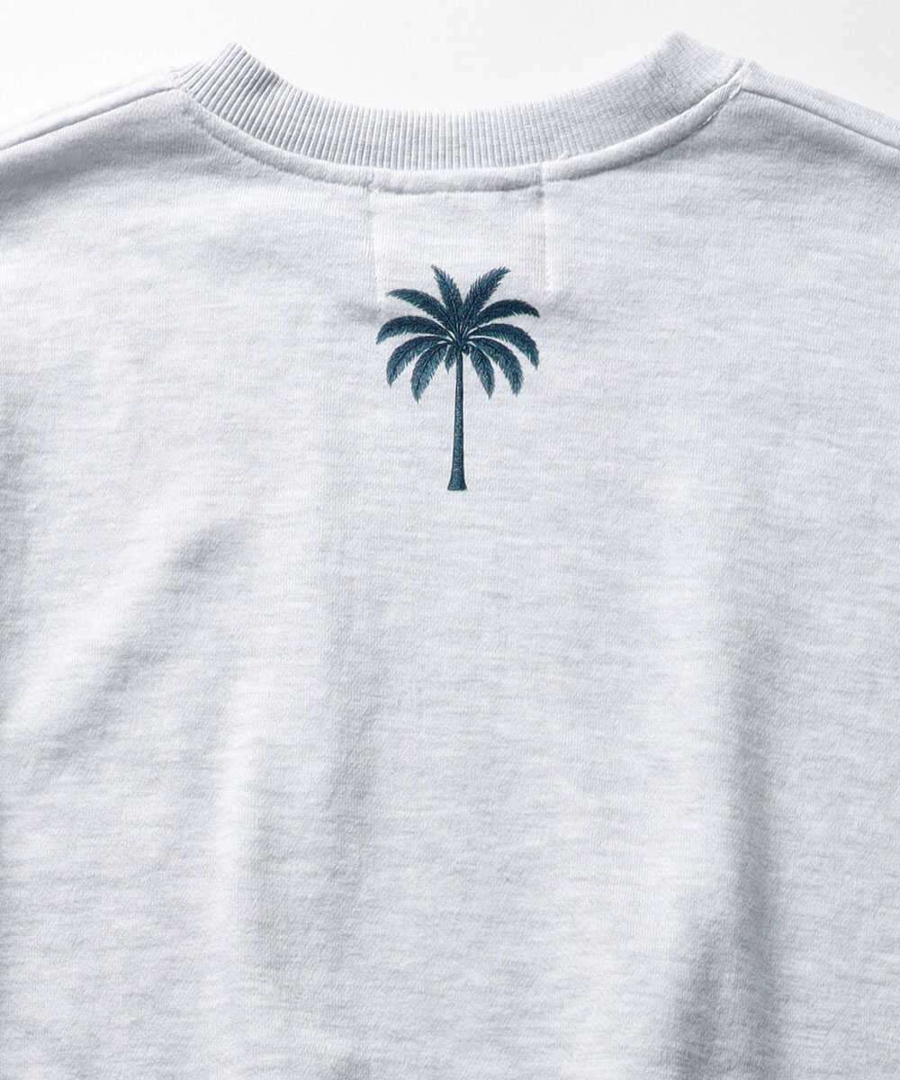 袖を通すだけで清々しい気分になれそうな、中厚ボディの別注スウェット。フロントはアーチブランドロゴが爽やかに映えるデザインで、後ろ姿ではバックネックにワンポイントで描いたパームツリーが開放的な気分を後押し。左袖のロゴも、白ボディに品よく映える配色に。