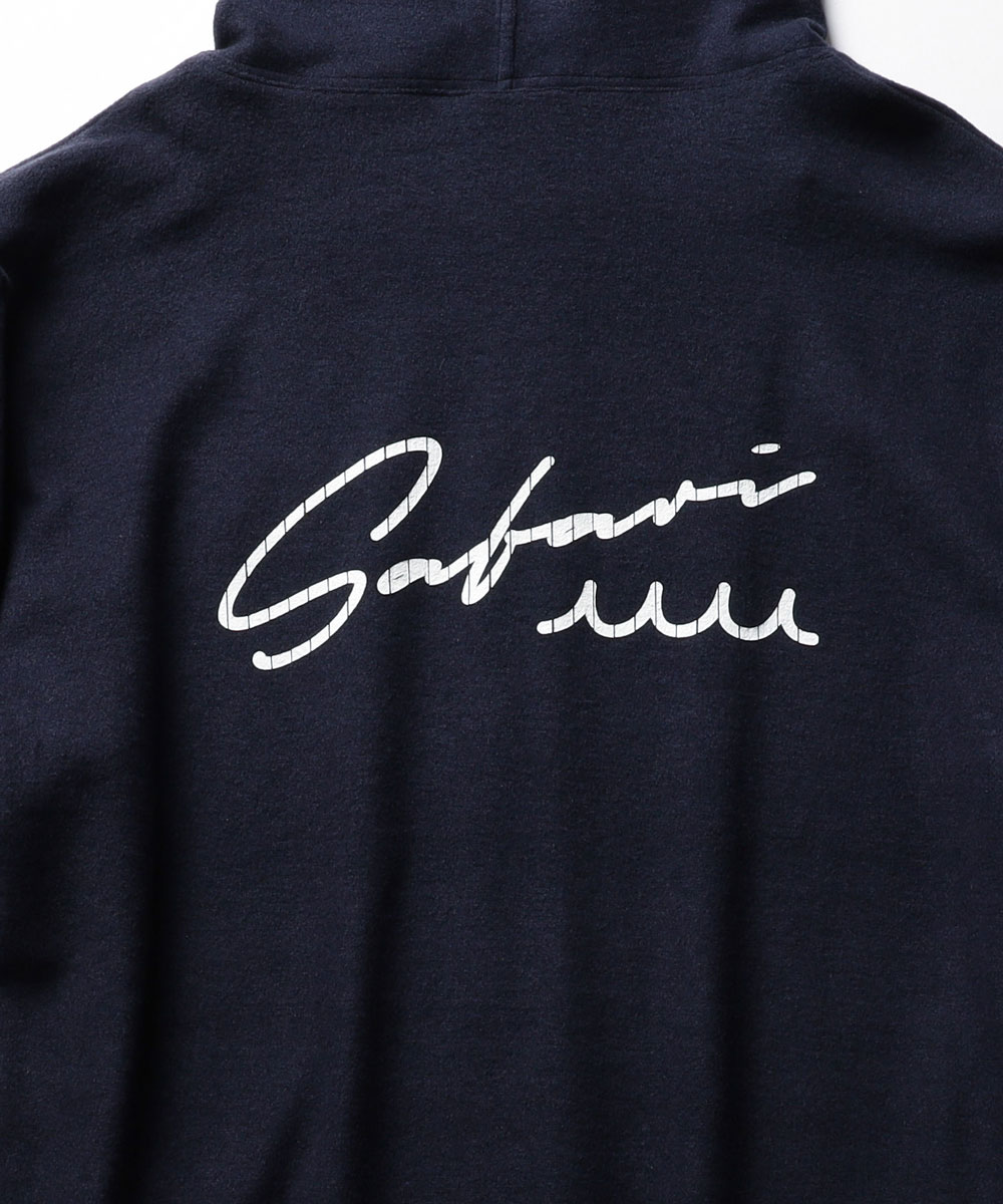 品のよさと機能性を兼ね備えたニットパーカ。天然素材のようなとろみとドレープが上質感を放つ一方、強度の面でも優秀。シワになりにくく、型崩れしにくい素材なので、ドライブでも気兼ねなく着られる。吸湿性と速乾性の高さも、快適な着心地をもたらしてくれるはずだ。背中には『Safari』との別注ロゴが鎮座。
