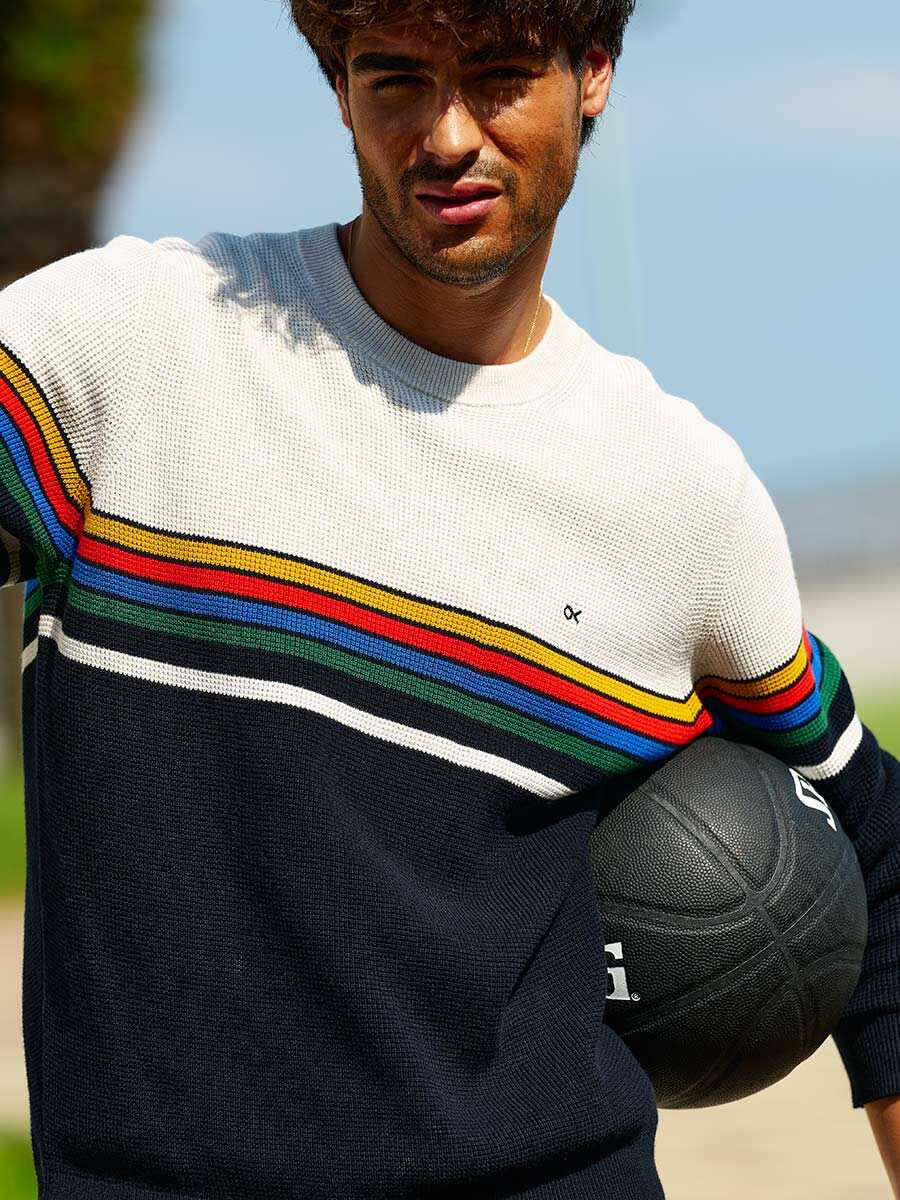 ボードスポーツの黄金時代をリスペクトし、70年代を象徴するスタイルを現代風にアレンジしたレインボーニット。コントラストの効いたデザインで、単品使いはもちろん、インナーとしてもコーディネートのアクセントに取り入れられるアイテム。胸元にさりげなくOKの刺繍が施されているのもポイント。