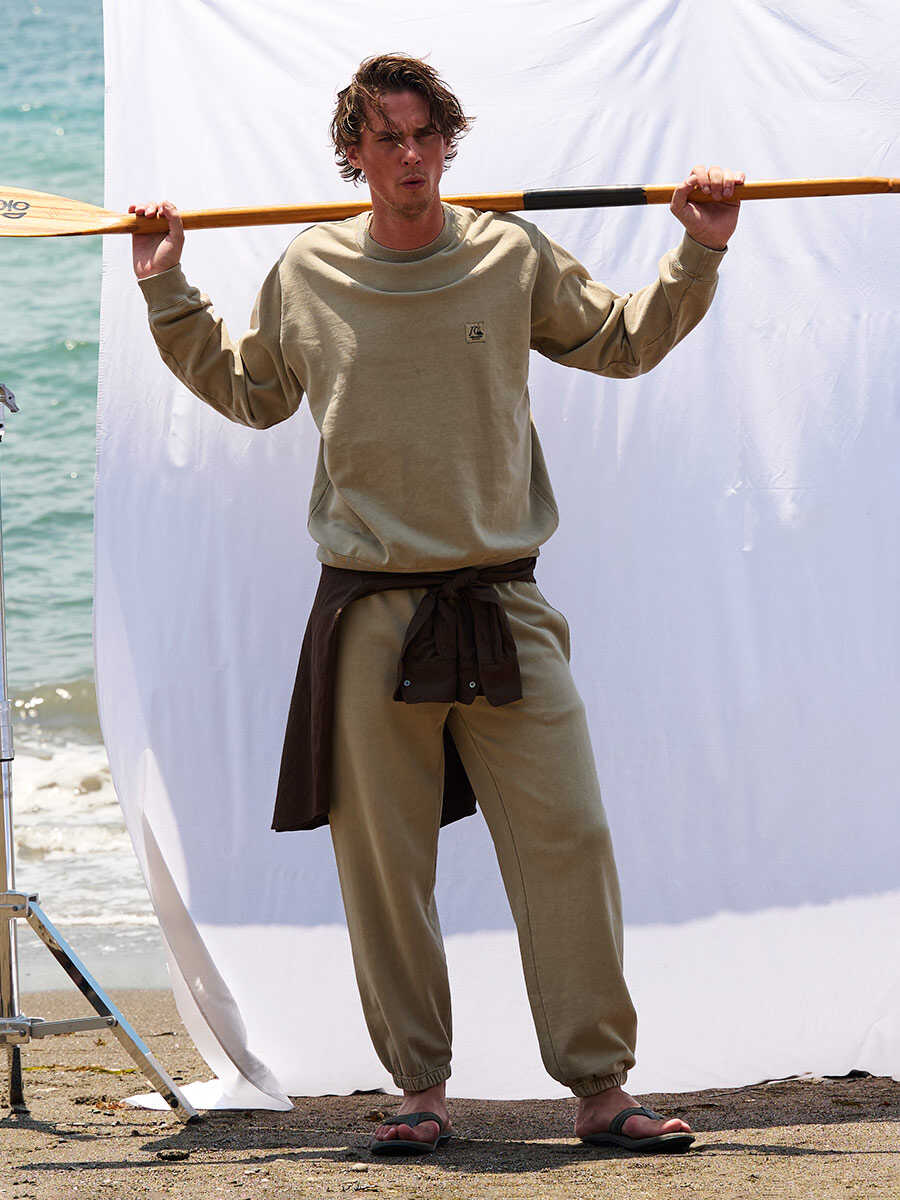 スウェットのセットアップで違いを印象づけたいときは、ピグメント加工でヴィンテージ顔に仕上げたこちらの新作を。トップスは〈クイックシルバー〉のヒストリーを彷彿とさせるグラフィックを背中にプリントした作りで、上下ともに味があるので単体でも主役感を発揮してくれる。シルエットは、上下ともにゆとりを持って着られるルースフィット。