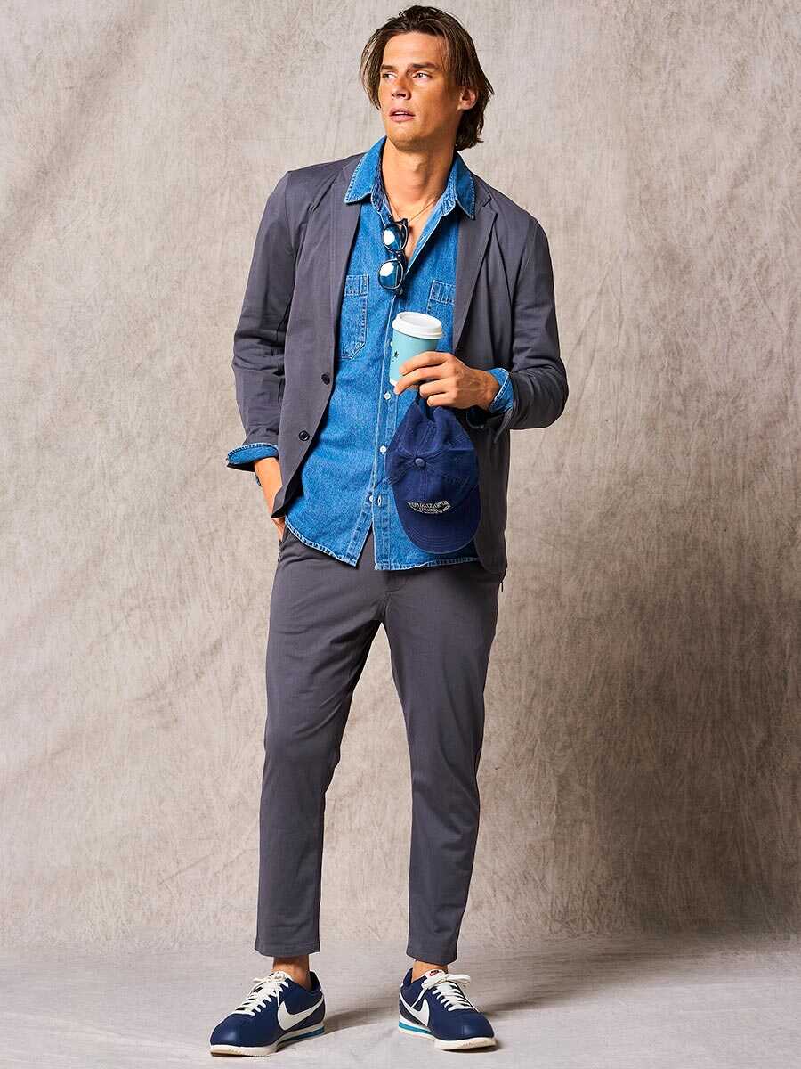 〈サファリ カレント〉が久しぶりに手掛けたテイラード系セットアップは、肌離れがよく通気性にも優れたストレッチ素材を採用。型崩れしにくく、シワにもなりにくいので、脱いだジャケットも気楽に持ち歩ける。トラウザース型のパンツは、ゴム仕様のウエストでベルトレスでも着用できる作りに。スニーカーにも合わせやすいアンクル丈も嬉しい。
