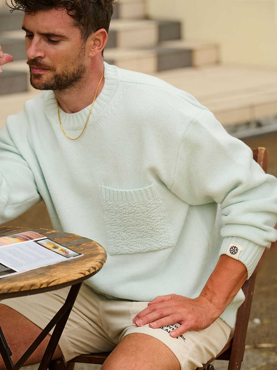 胸ポケット付きのメリノウールニットを、カリフォルニアを感じるカラーに別注。インラインの製品にあるエルボーパッチをあえて省いた作りにすることで、シンプルで着こなしやすいスタイルに。胸ポケの編み地の変化やピスネームなど、目を引くディテールも満載。