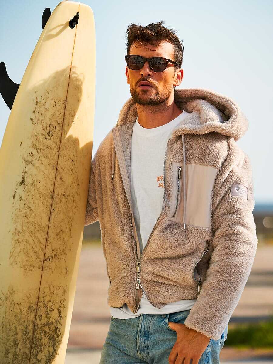 手触りなめらかなボアフリースで仕立てた、ジップアップフーディの“メンフィ”。マットな別地で切り替えた胸ポケットは、アウトドアテイストの意匠であると同時に、単色ボディにコントラストをもたらす効果も。高級感を感じるメタルパーツのあしらいは、さすがの〈タトラス〉。