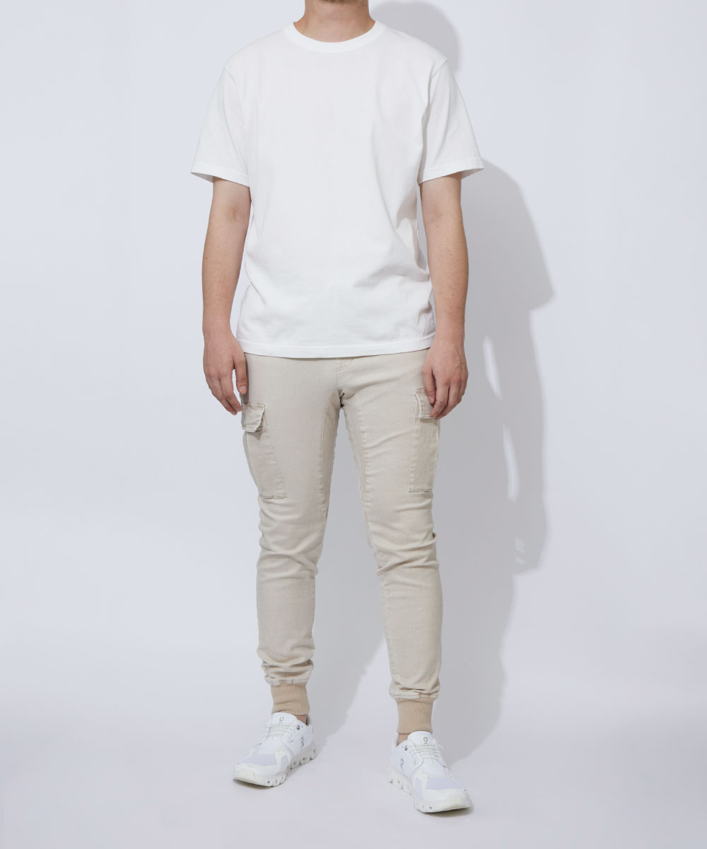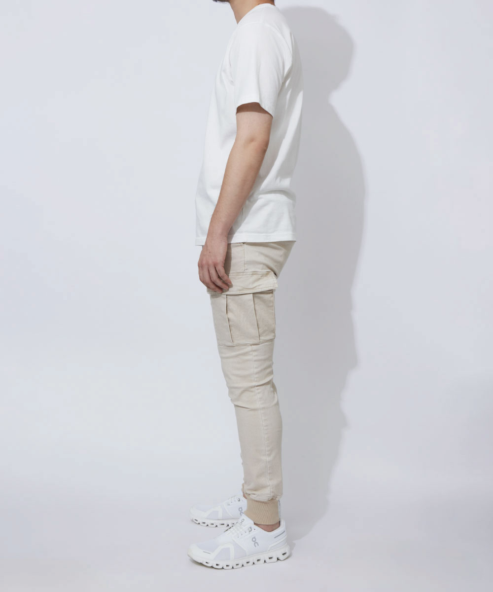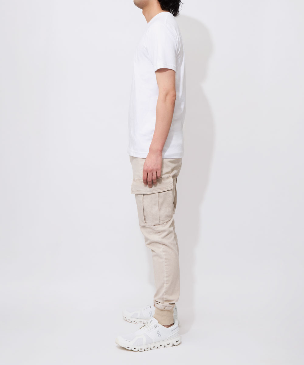脚の形に沿いつつも、ピタピタにならない、ちょうどよい塩梅のシルエット。野暮ったいカーゴパンツの印象をこの美シルエットで一気に払拭できる!
