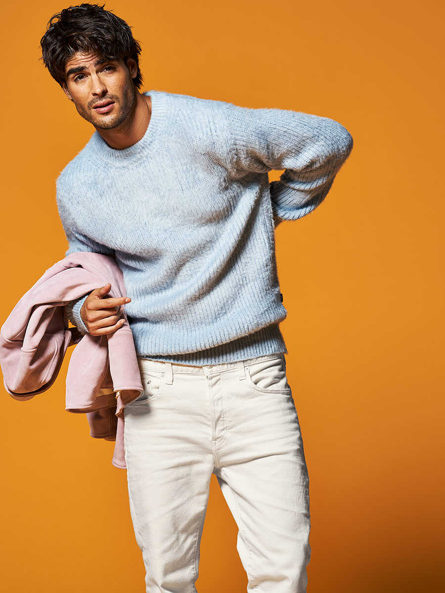 表面を毛羽立たせるブラッシュド加工を施し、風合い豊かに仕上げたコットンニット。畦編みニットにはない独特の表情が特徴的な1枚。明るいトーンのカラーリングでコーディネートに爽やかさをプラスしてくれる。驚くべきところは、カシミヤのような生地感でコットン100%だという点。ウールやカシミヤだと暑すぎる、というときにぴったりだから、是非ともワードローブに追加してほしい。