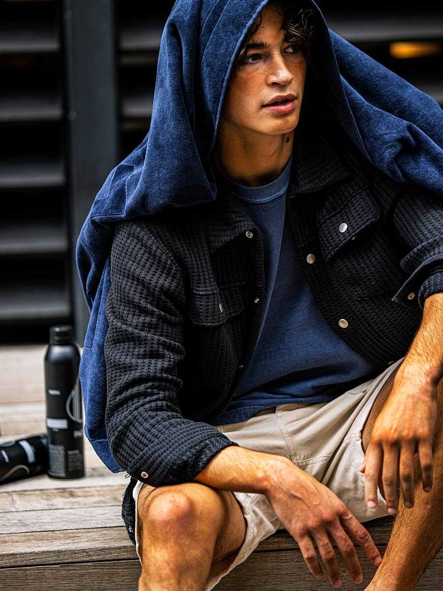 凹凸感のあるサーマル素材を使用した〈ダブルピー ウエストポイント〉のGジャン。やや肩が落ちるシルエットで仕上げており、大人の余裕を感じさせる1着。デニム生地のGジャンとは違い、肩肘張らずにリラックスして着られるのが特徴だ。ギラつかないマットなシルバーのスナップボタンが上品さをアップ。ノンストレスで着こなせるため、スタイリングの主役として活躍してくれること間違いなし。