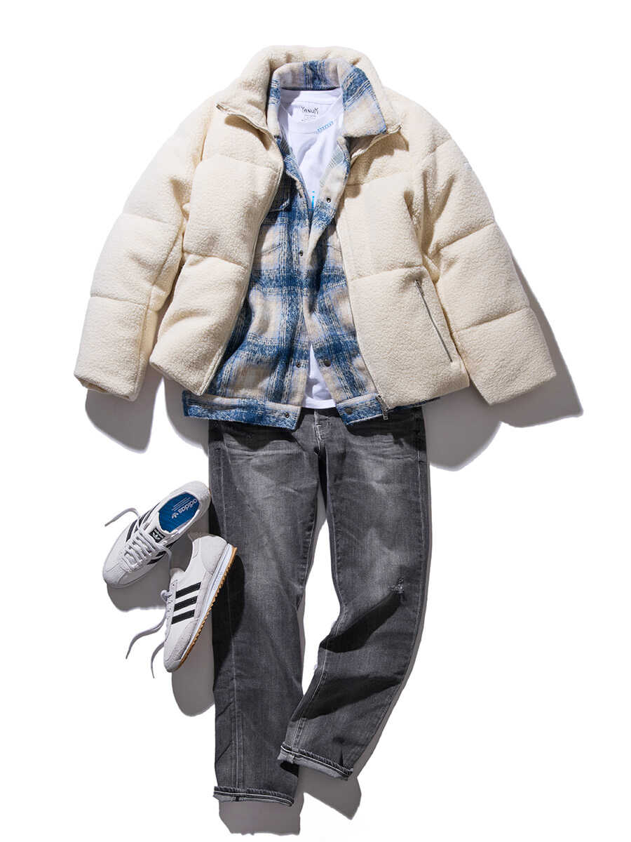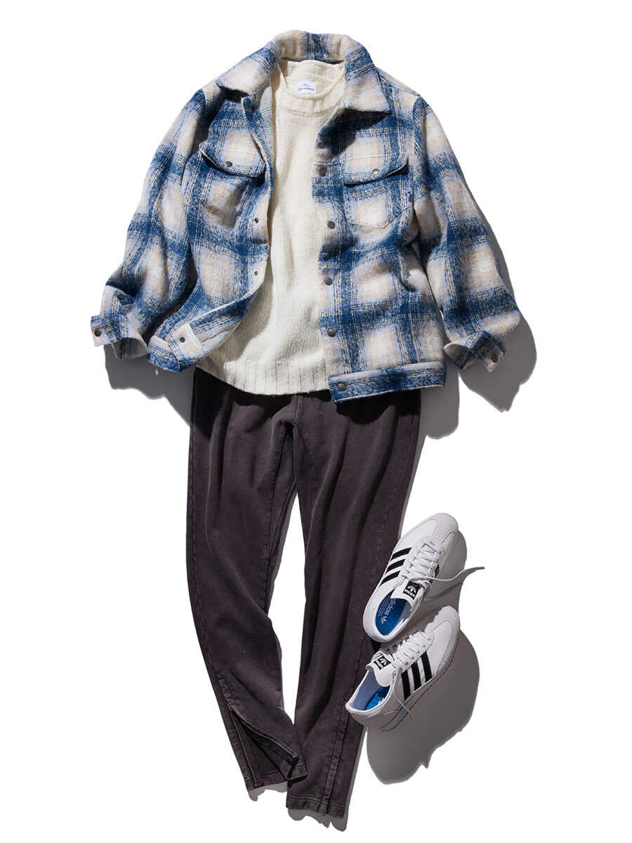 チェックシャツと思いきや、実はGジャン型ブルゾン。ボディはふわふわとした起毛生地で、フロントは脱ぎ着がしやすいマットシルバーのスナップボタン仕様なのが嬉しい。着丈はすっきりとした印象で着こなせる短丈設計で、イージーパンツの“ほどピタ”感とも相性がいい。