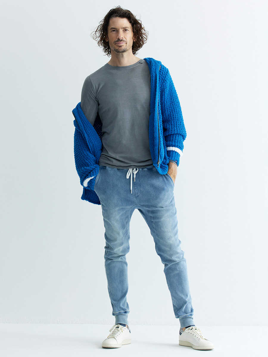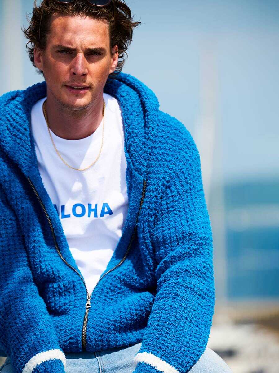 凹凸感強めのワッフル編みで表現したのは、ソフトな着心地をもたらしてくれるモコモコジップパーカ。両袖の白ラインがあることで、マリンブルーの清々しさが際立って見える。ゆったり設計のフードはあえてドローコードを省き、すっきり見えするデザインに。