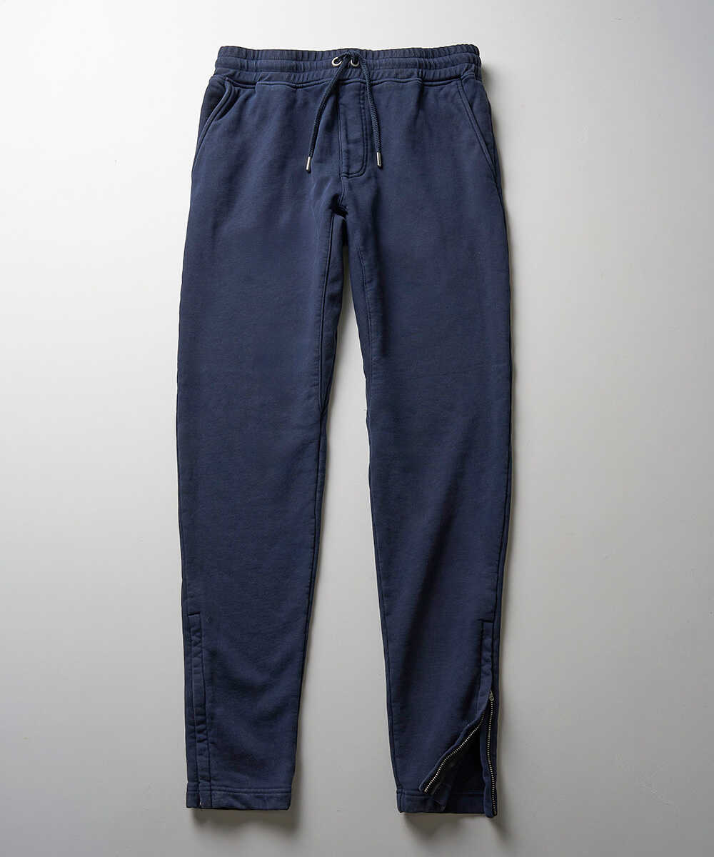 〈ダブルピー ウエストポイント〉で人気のイージーパンツから、この冬新たに登場したスウェットパンツバージョン。その新色が、この褪せネイビーだ。脚のラインが綺麗に見える“ほどピタ”シルエットに、腿の内側はガゼットクロッチの切り替えで驚きの動きやすさを実現。ほどよい褪せ加工と裾リブの仕様で、ダラシなくならず、こなれ感抜群!